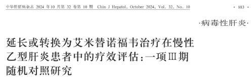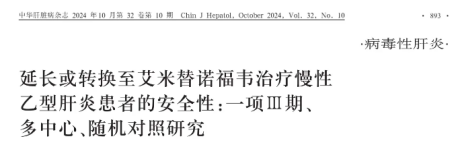 1.刘智泓,金清龙,张跃新,等. 延长或转换为艾米替诺福韦治疗在慢性乙型肝炎患者中的疗效评估:一项Ⅲ期随机对照研究[J]. 中华肝脏病杂志,2024,32(10):883-892.